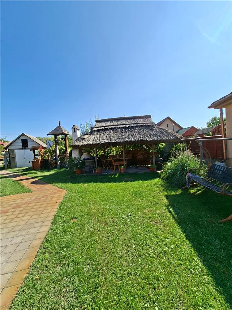 A környezete az ingatlannak parkosított, rendezett, az udvar térkövezett. Megépítésre került pihenésre, családi-baráti összejövetelek tartására alkalmas, igényes, nádfedeles kerti pavilon (kiülő) búbos kemencével.