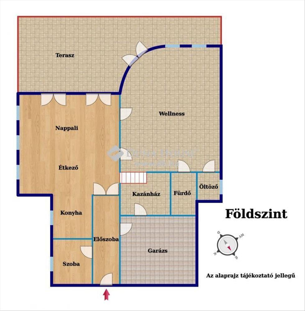 a klasszikus stílusban kialakított, amerikai konyhás nappali, ahol működő kandalló biztosítja a téli esték meghittségét. Innen közelíthető meg a wellness helyiség is, ahol a testedzés és pihenés egyaránt az évszaktól függetlenül biztosított (igény szerint itt ellenáramoltatós medence kialakítására is van lehetőség), az innen nyíló fürdőszobában pedig masszázskabinos zuhanyzó, valamint finn szauna garantálja a jól megérdemelt lazítást. Szintén a wellness helyiségből nyílik egy öltözőszoba is.