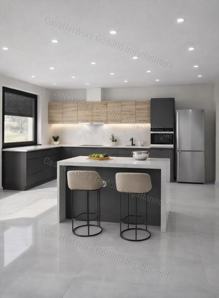 A nappalihoz kapcsolódik egy nagyméretű, modern konyha-étkező, amely ideális családi és baráti összejövetelekhez.