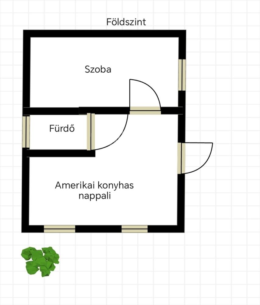 Földszint: előtér, amerikai konyhás nappali, hálószoba, fürdőszoba wc-vel.