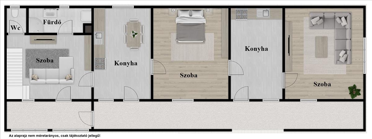 A 95nm-es verandás házban 3 szoba, konyha-étkező, zuhanyzós fürdőszoba és külön mellékhelyiség található. Ipari árammal ellátott, fűtés konvektorokkal, kályhával és központi fűtéssel megoldott, a nyári hűvösségről pedig klíma gondoskodik.