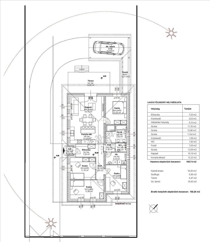 A lakótér 107 nm + 18 nm -es terasz + szélfogó + 4. 47 Nm-es tároló + 16. 43 Nm-es gépkocsi beálló.