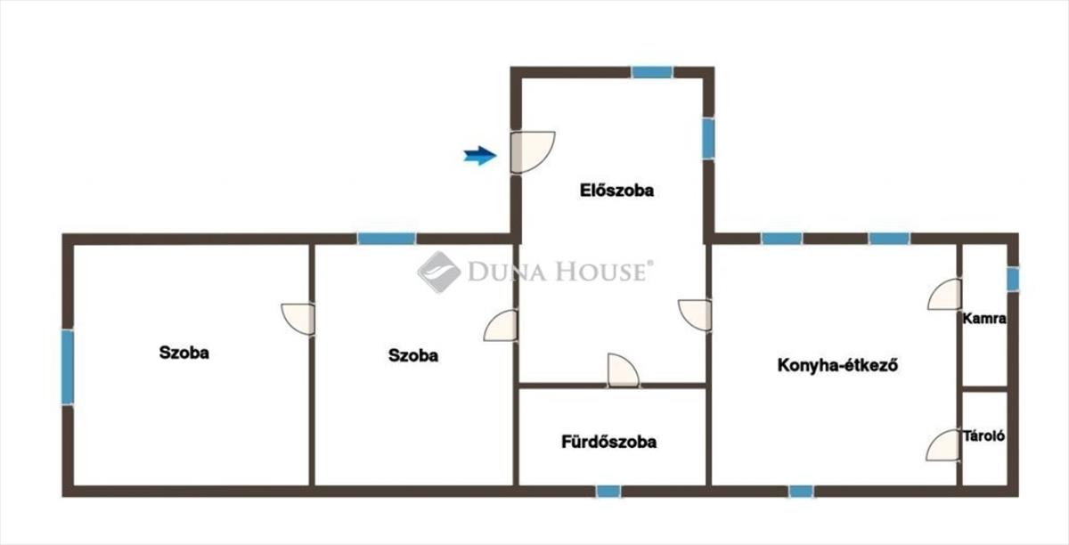 - helyiségek: előszoba, konyha-étkező, kamra, tároló, fürdőszoba WC-vel, 2 szoba