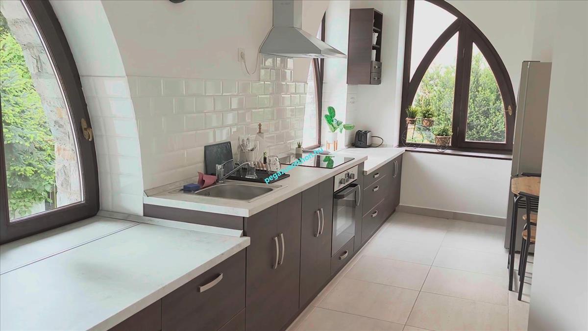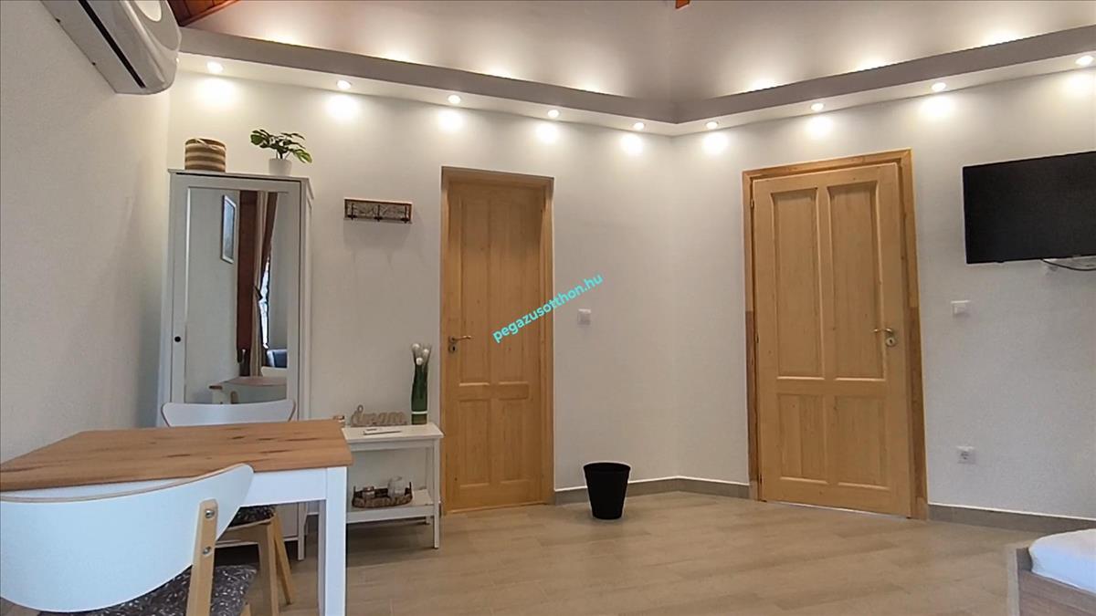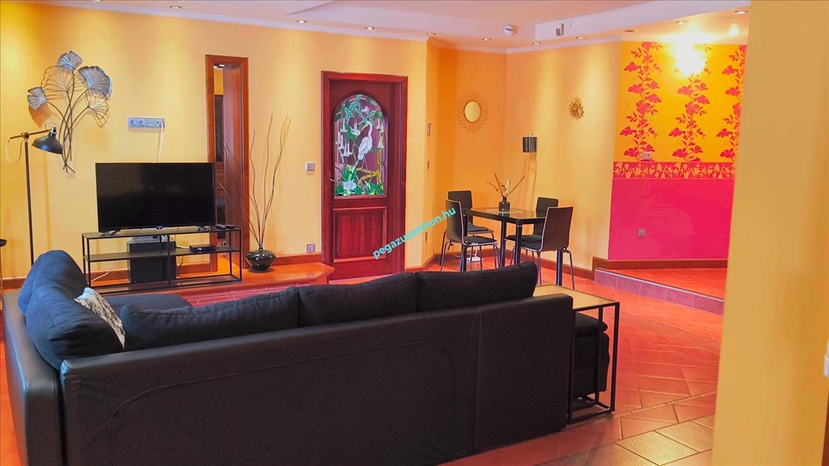 -Földszinti egysége külön apartmant alkot, nagyméretű nappalival, hálószobával, a fürdőszobában szaunával, és konyhával.