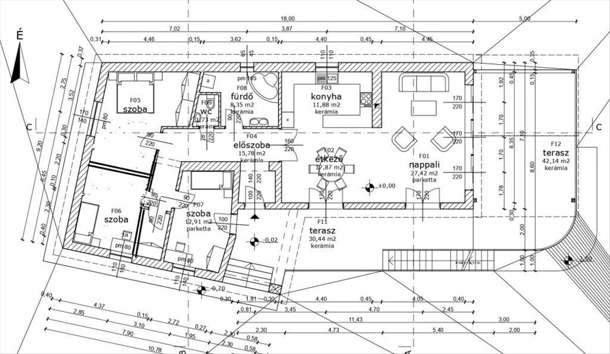 Helyiségek: nappali (21, 4 nm), konyha (11, 9 nm), étkező (17, 9 nm), 3 szoba (13, 5 és 12, 9 és 11 nm), 2 fürdő (7, 1 és 3, 2 nm), kamra (4, 7 nm), közlekedő (17, 4 nm), gardrób (2, 6 nm) és extra beépíthető tetőtér (42 nm).