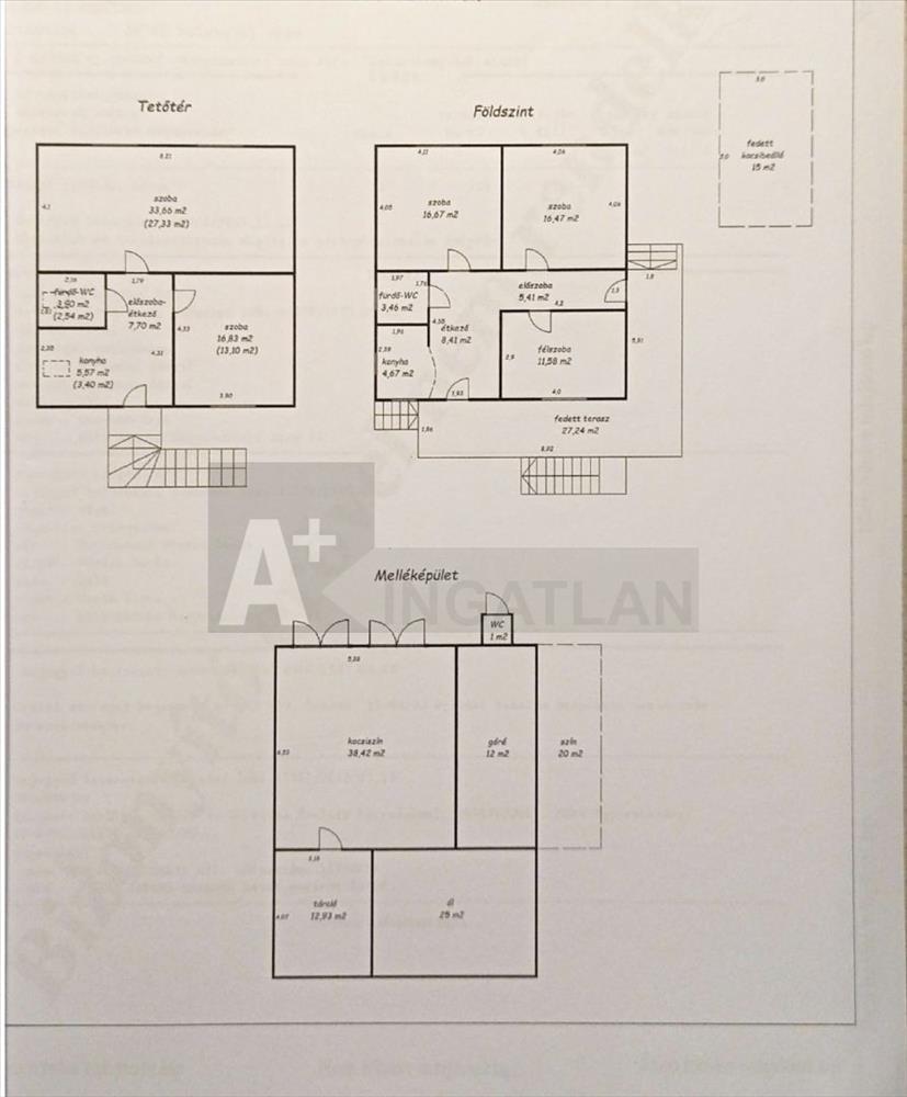 Melléképület : dupla garázs 38, 42 m2, tároló 12, 93 m2, góré 12 m2-es, ól 25m2-es és egy udvari, ugyanakkor angol wc. Az épületek mögött pedig a kert, gyümölcsfákkal.
