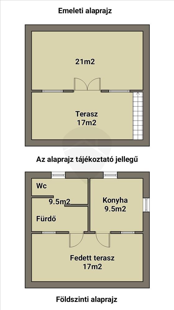 Földszint (19 m²): tágas konyha és fürdőszoba, mindkettő járólappal burkolva