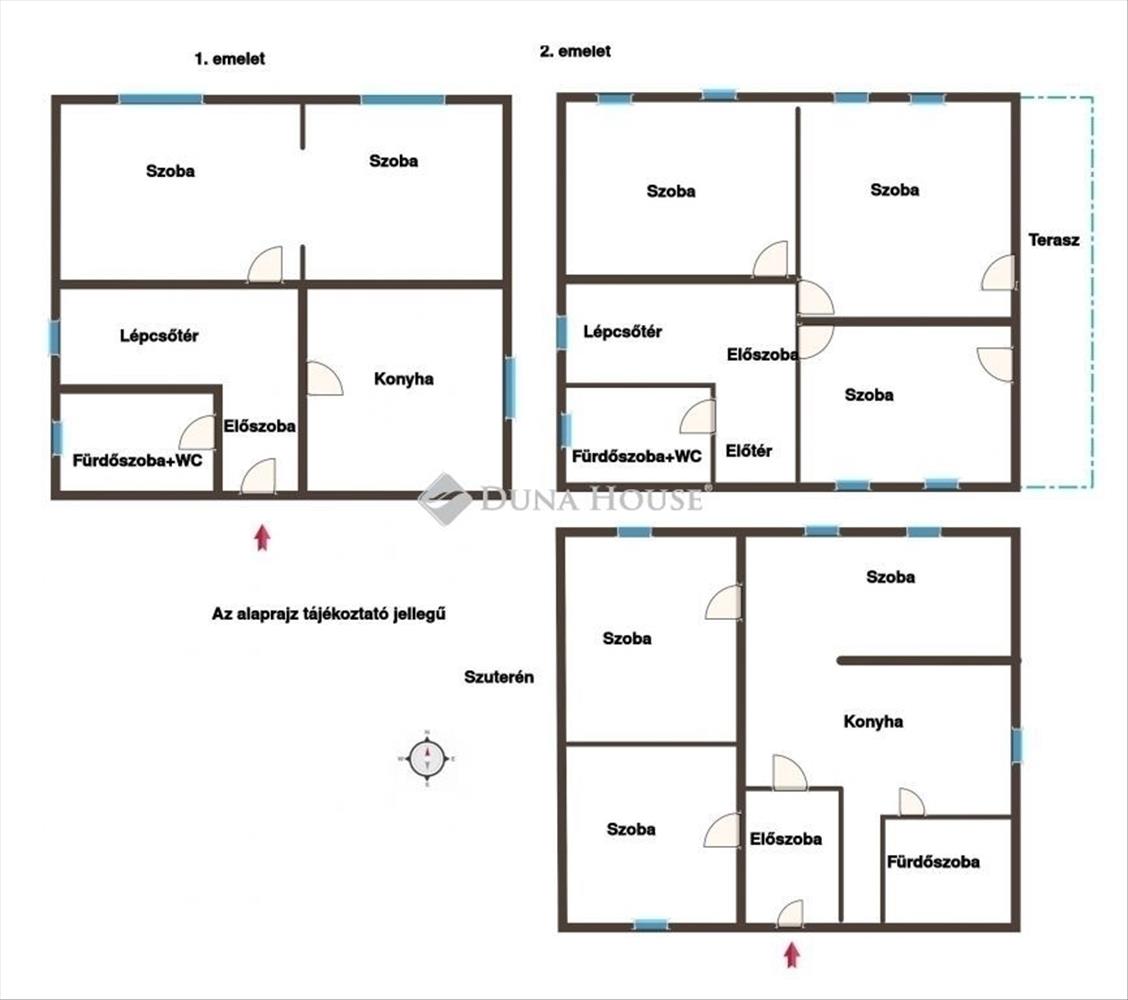 Emelet: két külön bejáratú szoba, konyha, fürdőszoba, előszoba
