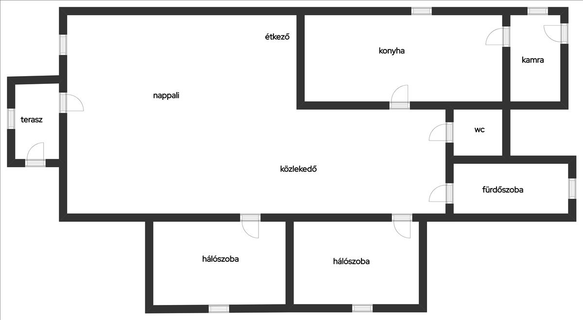 fedett hátsó bejáró, spájz, pincelejáró(a házból)konyha-étkező, közlekedő, nappali, két utcafronti szoba, fürdőszoba, külön wc, valamint egy kb. 10Nm-es beépített terasz a főbejáratnál.