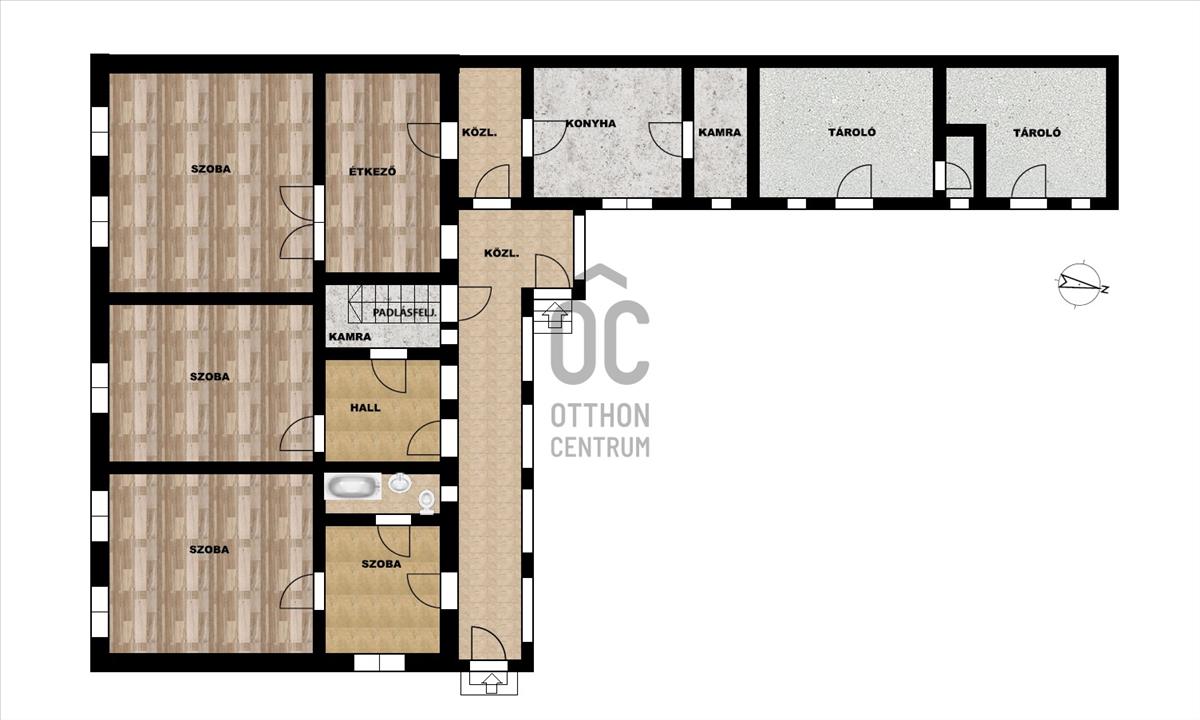 Szobák padlóburkolata laminált parketta, többi helyiség járólap.