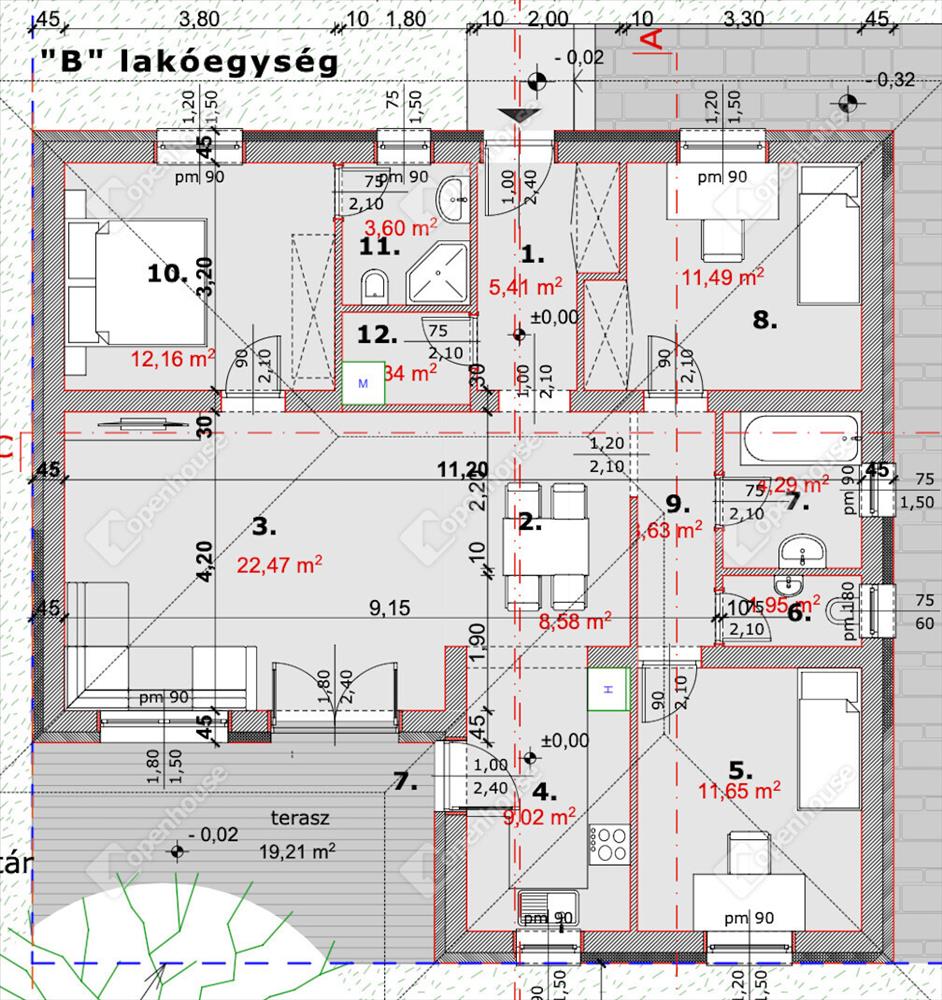97 m²-es családi ház + 18 m² épített terasz kerámia burkolattal,