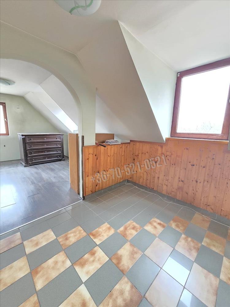 Az emeleti rész elosztása: lépcsőház, előtér, nappali, konyha, 3 szoba, 1 félszoba, fürdőszoba wc-vel, tároló.