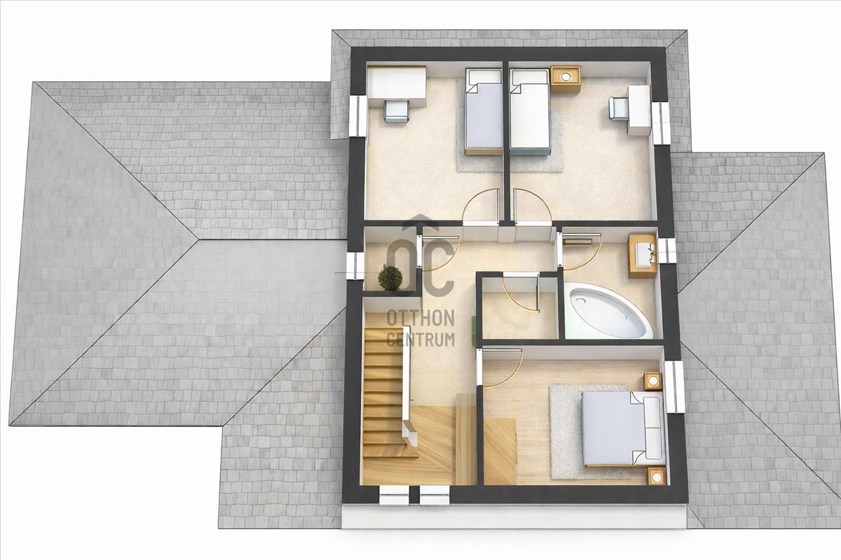 - Emelet: közlekedő, 3 különnyíló hálószoba, gardrób, fürdőszoba, külön WC.
