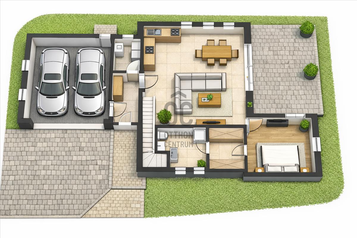 - Földszint: előtér, amerikai konyhás nappali étkezővel, hálószoba, gardrób, fürdőszoba, háztartási helyiség, garázs, terasz.