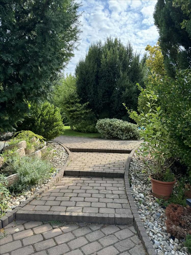 A 970 nm-es telken található 390 nm-es ház intim takarásban van a sokféle fától, cserjétől, amit csak fokoz az udvar érdekes és praktikus szintezése.