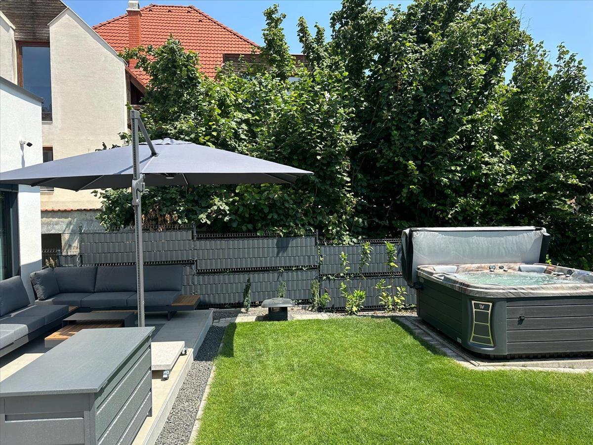 A kertkapcsolatos földszinti teraszról közvetlenül a jakuzzival felszerelt pihenőkert érhető el, ahol teljes intimitás és nyugalom vár.