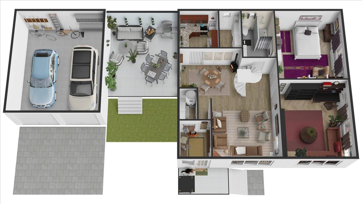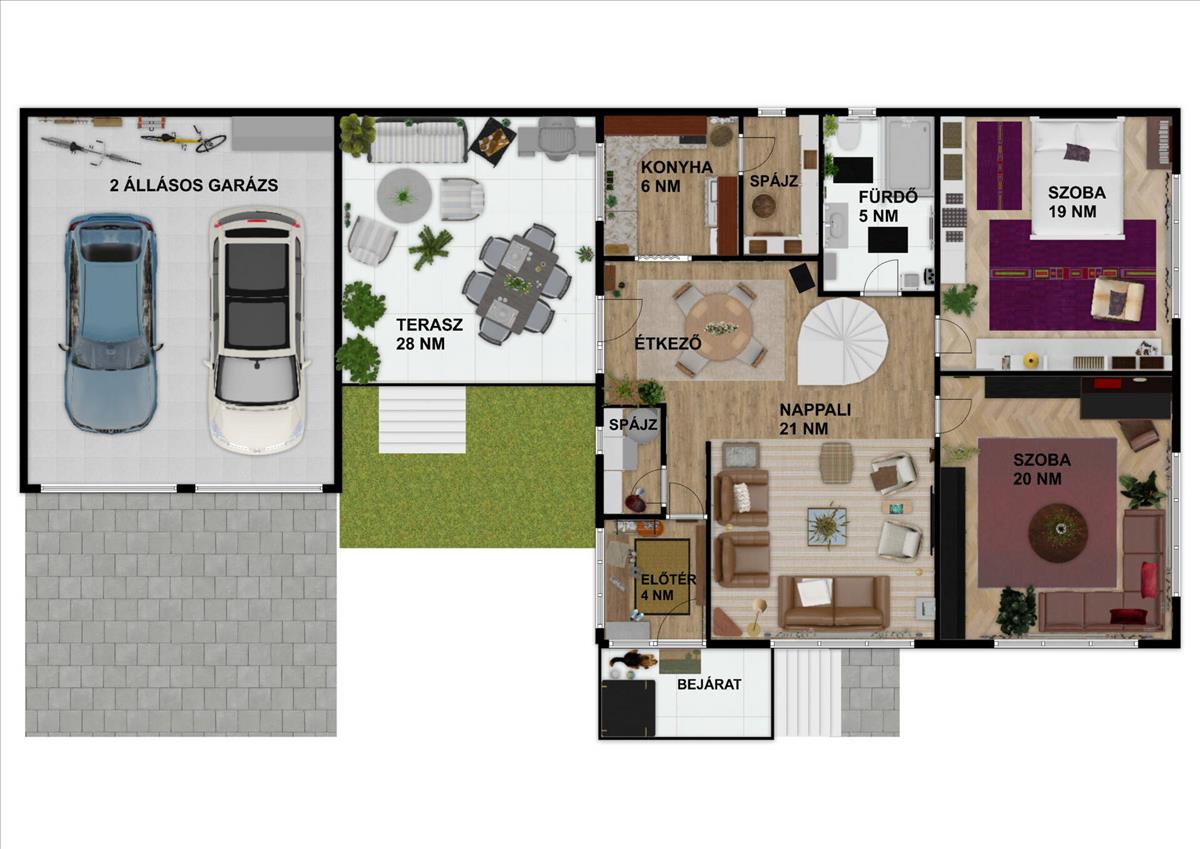 A házhoz egy 28 nm -es terasz kapcsolódik, amely közvetlenül az étkezőből közelíthető meg, így kényelmes kapcsolatot teremt a belső terek és a kert között. a terasz mellett található a kétállásos garázs, amelyhez térkövezett feljáró vezet. Garázs mellett pedig egy kosárlabda placc.