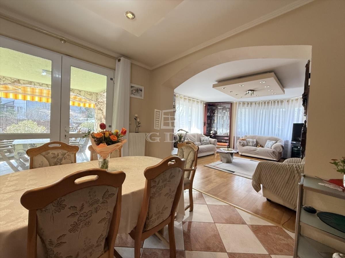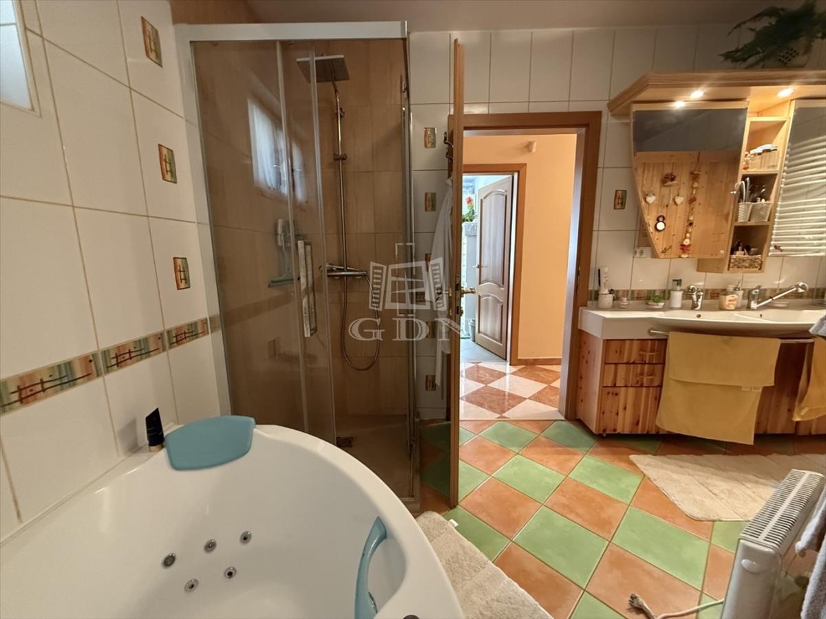 Földszint : Az előtér a ház központi terébe nyílik, a bejárati ajtótól jobbra egy- akár külön választható lakrészként- 1 hálószoba, előszoba, fürdő wc-vel helyezkedik el, közvetlen bejutással a minden funkcióval felszerelt konyhába. a bejárati ajtótól balra van a garázs (külön bejárattal), és az előszobából balra egy kamra. a bejárati ajtóval szemben az előszobából az étkezőbe jutunk, itt található még a földszinten egy tágas világos nappali, 1 gardrób, egy fürdő wc-vel, szaunával, háztartásihelyiség, vendég wc, és egy hálószoba.