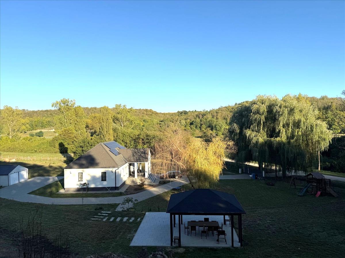 Telek: Az összesen 7605 m²-es, öt helyrajzi számon fekvő, tágas, rendezett telken dupla beállásos garázs, egy fedett, nagyméretű filagória, valamint két ásott kút is helyet kapott. a kertben kb. 40 Gyümölcsfa és szőlő található, az egész terület körbekerített, így teljesen privát, biztonságos környezetet nyújt.
