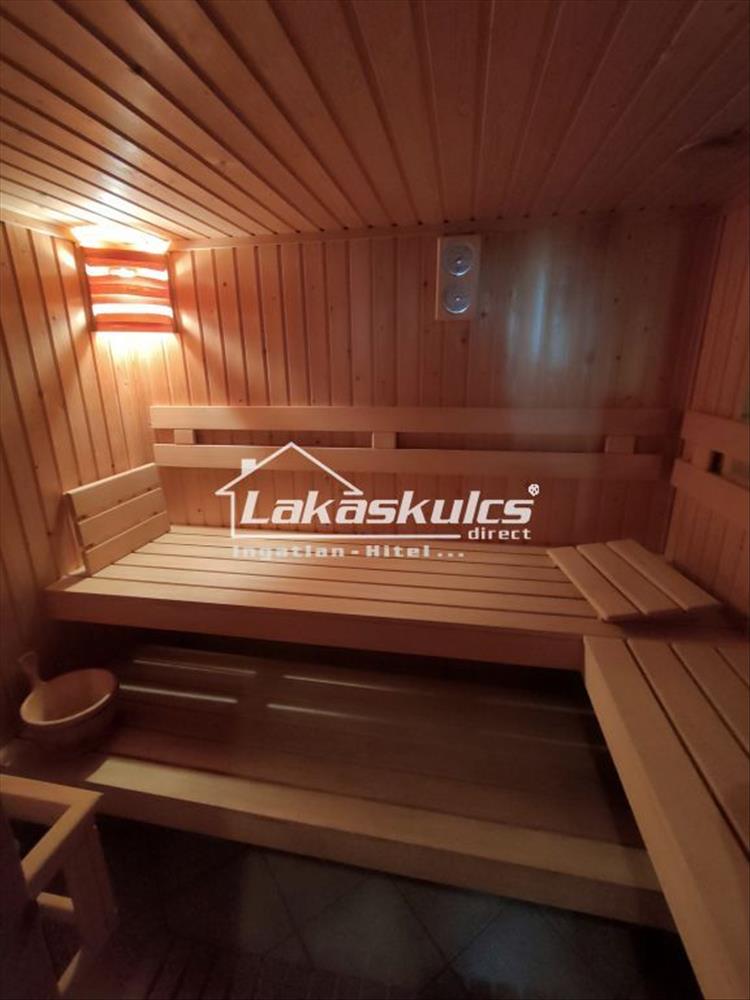 A telken található még egy szaunával felszerelt vendégház fedett terasszal, kerti sütögetővel és tárolóval. a kert szépen gondozott gyeppel, hatalmas fákkal, dísznövényekkkel és fűtött MEDENCÉVEL.
