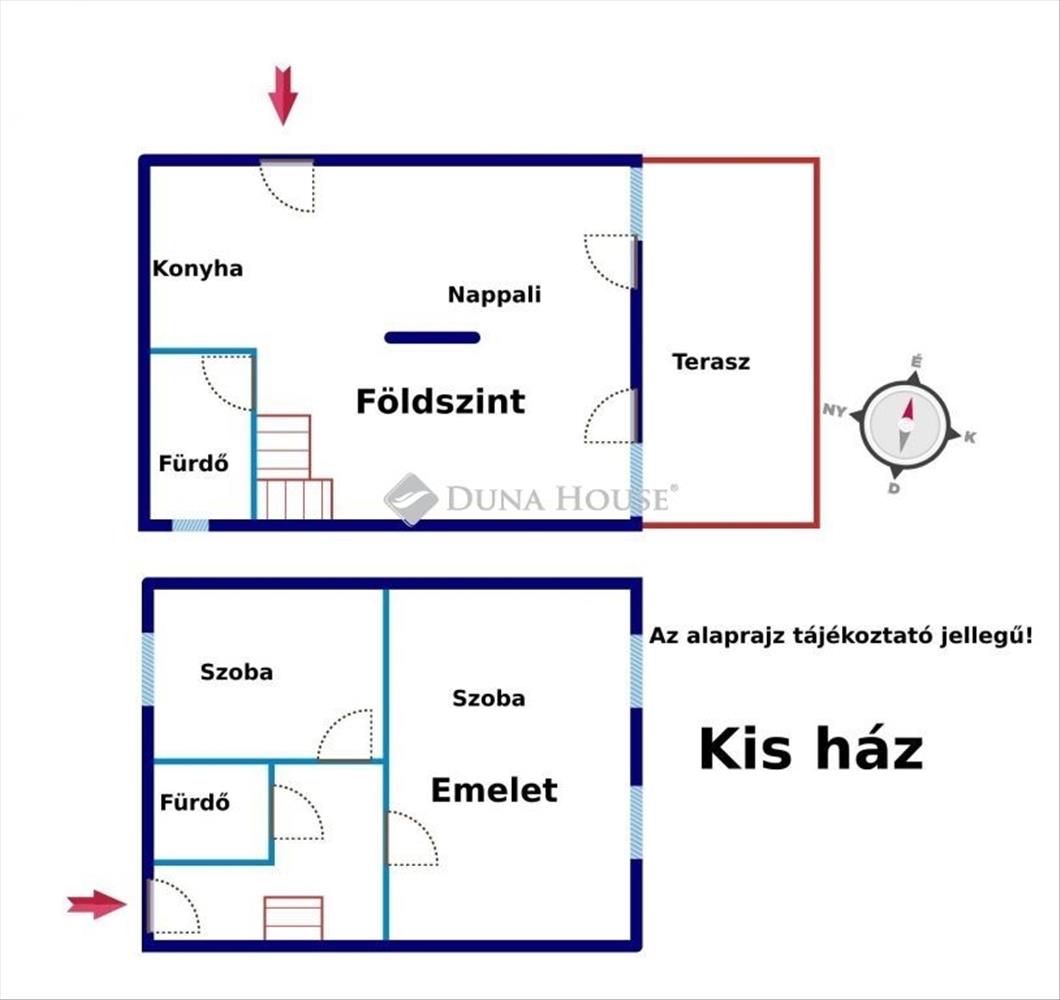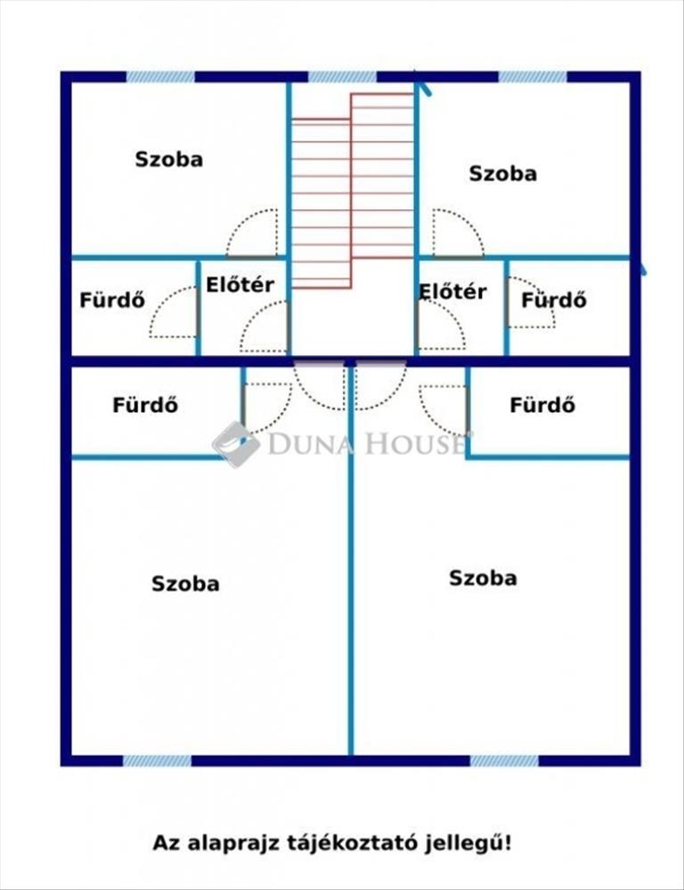 Az első emeleten 4 szoba, a tetőtérben pedig további 2 helyezkedik el. Itt találhatóak a kiszolgáló helyiségek is.