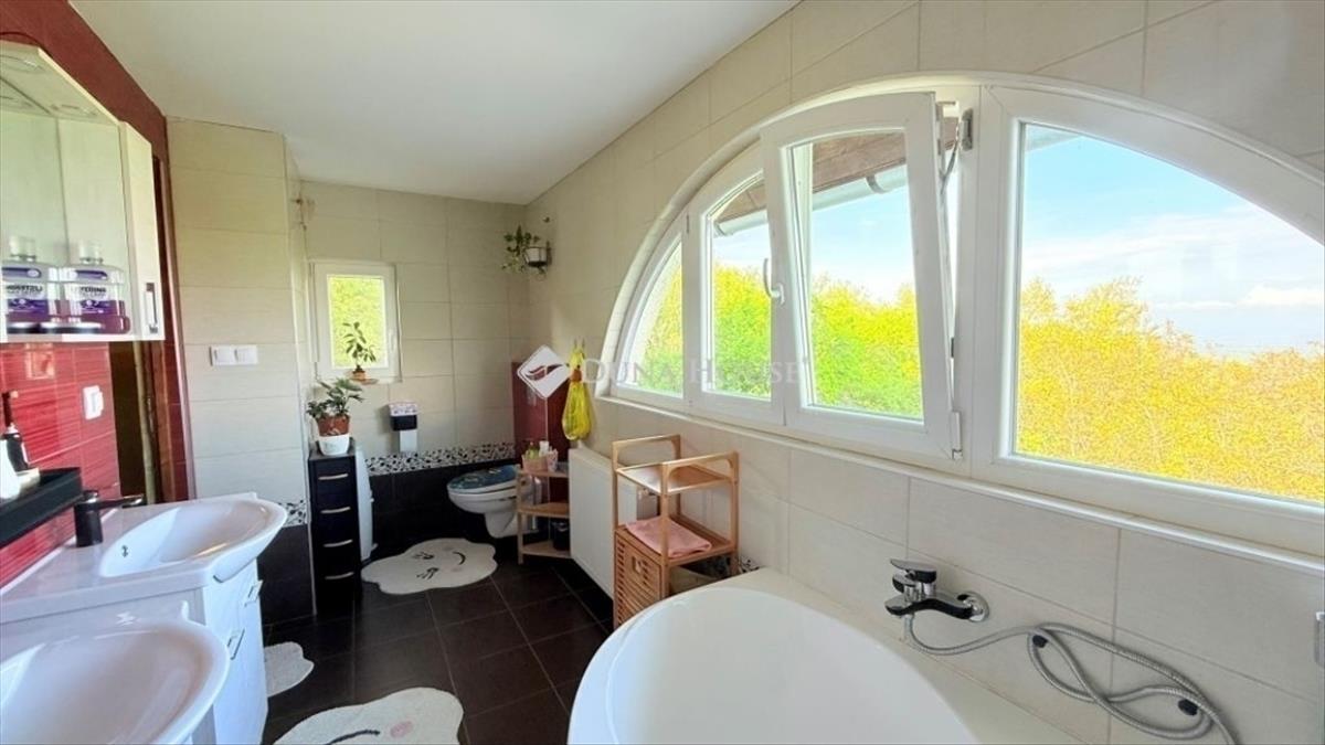 Elvehetetlen panoráma az erdő mellettAki maximális nyugalomra, csendre és pihenésre vágyik otthon a nyüzsgő mindennapok után, az megtalálta álmai otthonát. Szentendrén, a Kada csúcson eladó sorba került ez az egyedi jegyeket hordozó, különleges családi otthon. a panoráma mellett az erdő közvetlen szomszédsága is rendkívül hangulatos és szemet gyönyörködtető. Eredetileg az 1970-es években, kőből készült ház arra a koncepcióra épült, hogy minden helyiségből az elvehetetlen panorámát élvezhessük. Ennek megfelelően minden helyiség nagy ablakokkal rendelkezik, hogy szinte a természetben érezzük magunkat. a földszinten az előszobába, majd onnan az étkezős konyhába jutunk. a nappalit egy duplaszárnyú terasz ajtóval akár egybenyithatjuk a kb. 40 Nm-es fedett terasszal. Semmi nem zavarja a pazar kilátást. Található még itt egy zuhanyzós fürdőszoba is. Lépcsőn jutunk a tetőtérbe, ahol az átalakítást követően egy kellemes méretű hálószoba terasszal, egy nagy méretű fürdőszoba, a közlekedőben gardrób, és egy gardrób/tároló/dolgozó került kialakításra. Igény esetén két hálószoba is megoldható. Mindenhonnan hatalmas, egyedi ablakokon keresztül csodálhatjuk a kilátást. Akinek igénye van több szobára, a terasz beépítésével is nyerhető még egy vagy két hálószoba. 2021-Ben a házat teljes mértékben felújították műszakilag és esztétikailag egyaránt. a fűtésről egy gázkazán gondoskodik, alsó szinten padlófűtés, emeleten radiátorok, illetve hűtő-fűtő klíma található. a ház alacsony rezsivel fenntartható, hála a 20 cm-es grafitos szigetelésnek, valamint a szaldó elszámolásban működő, bővíthető 6 kW-os napelemes rendszernek. a teljes terasz alatt található még 3 helyiségből álló tároló, ami akár nyári konyhának, vendéglaknak, vagy a lakótérhez építve hálószobáknak is alkalmas lehet. a kert szintezett a lejtése miatt, ennek ellenére jól kihasználható akár kisgyerekkel is. a ház külső, esztétikai felújítása, kert rendezése, autóbeálló rendezése az új tulajdonosra vár. FIX 3% lakáshitelre megvehető