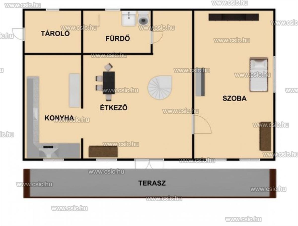 Beosztását tekintve az alsó szinten egy 24 m2es fedett teraszról belépve egy nappali tér fogad minket étkezővel. Innen vezet fel a csigalépcső a felső szintre. Ezen a szinten még egy konyha, tároló, egy zuhanyzós fürdőszoba és egy nagyméretű szoba kapott helyet.