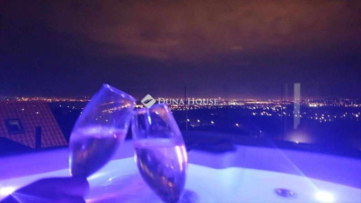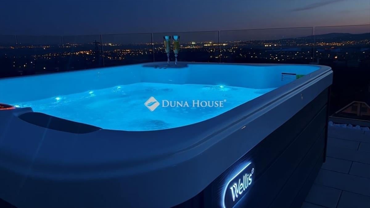Emelet: üvegkorlátos, tágas lépcsőházból nyíló ~40 m2 panoráma terasz, 3 személyes Wellis jakuzzival. Szülői háló, gardróbszoba, prémium fürdő walk-in zuhanyfallal, Wellis szabadon álló káddal, dupla mosdóval és wc-vel.