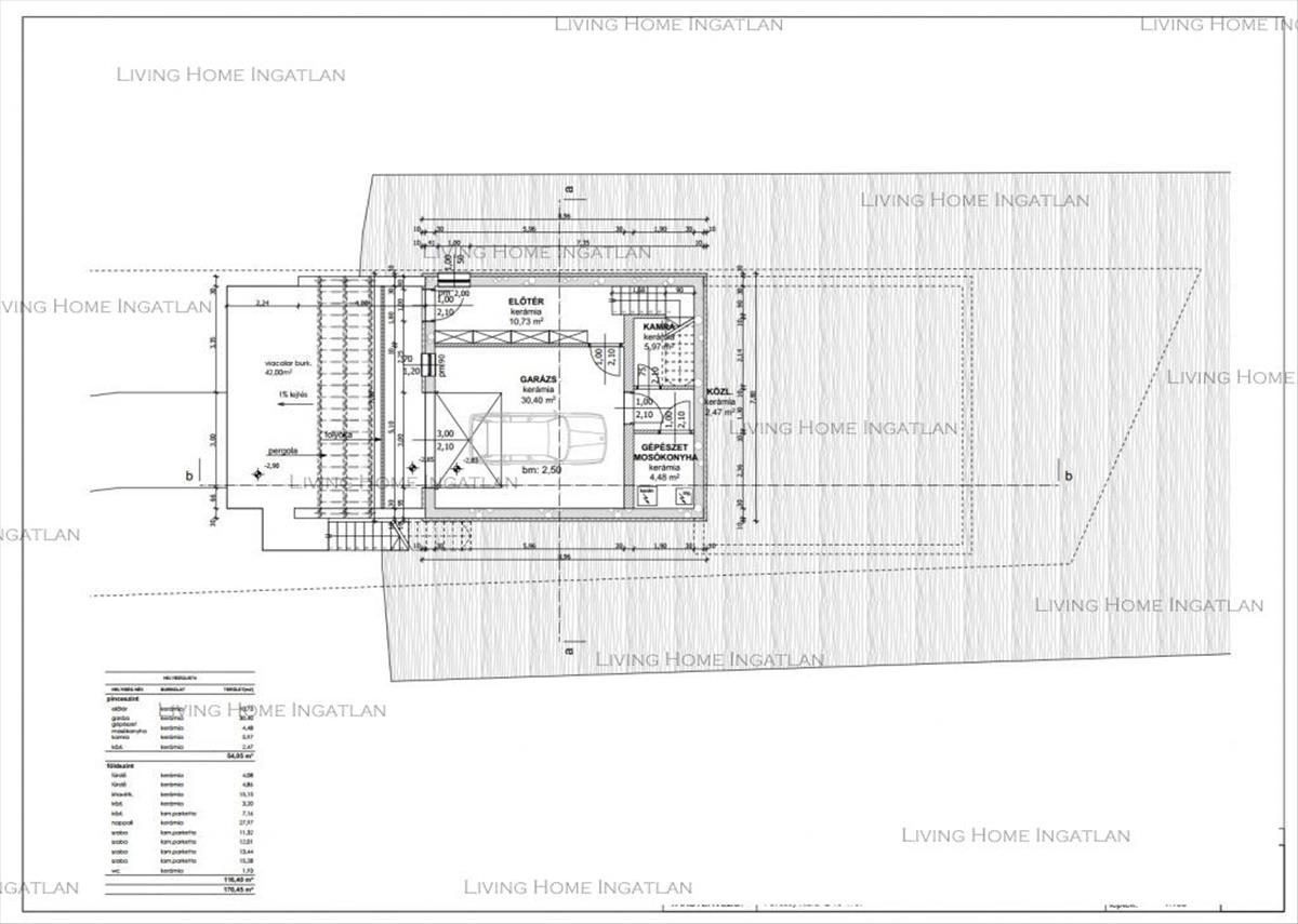 A pinceszinten/földszinten lett kialakítva a garázs + gépészeti helység, kamra, mosókonyha, előszoba.