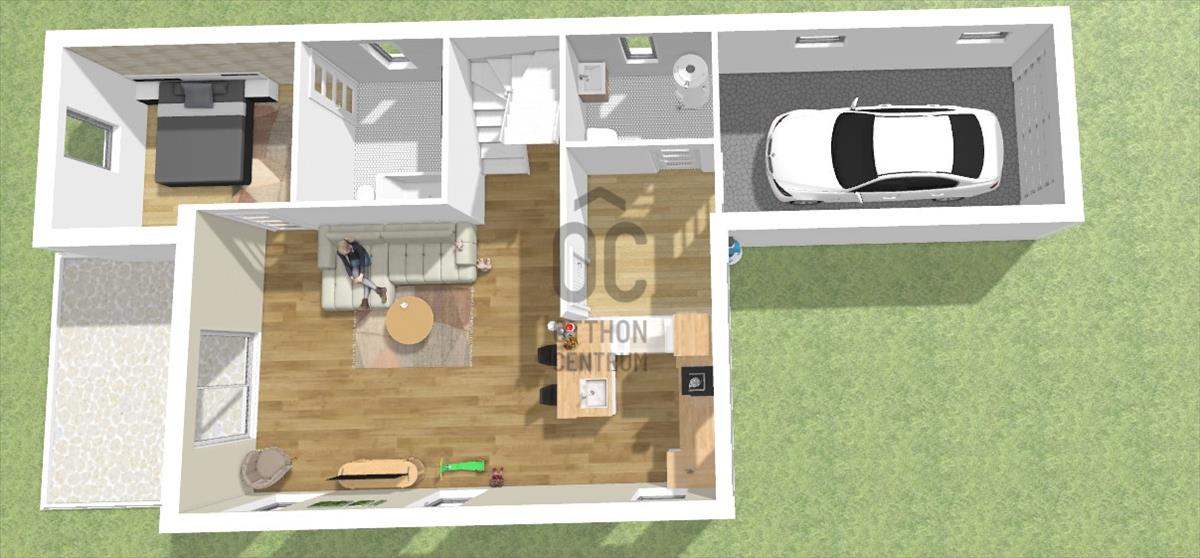 Alsó szinten garázs, nappali, étkező-konyha, hálószoba, fürdőszoba, vendég toillet.