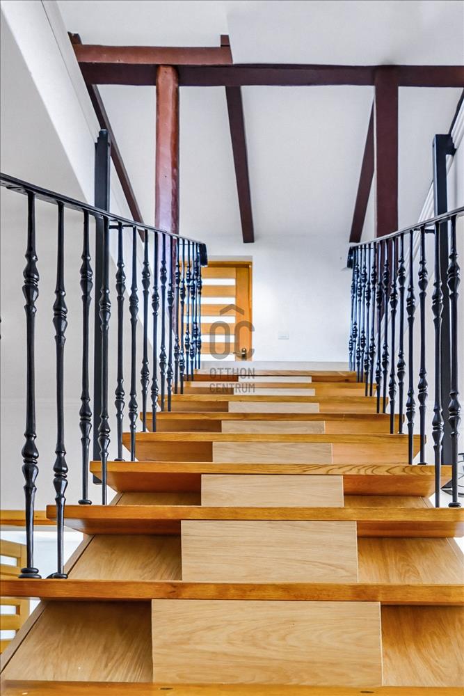 A tetőtérből részleges panoráma tárul elénk, a földszinten pedig dupla garázs, műhely, tárolók és kazánház is helyet kapott. a fűtésről gázkazán, hűtő-fűtő klíma és egy hangulatos téglakályha gondoskodik.