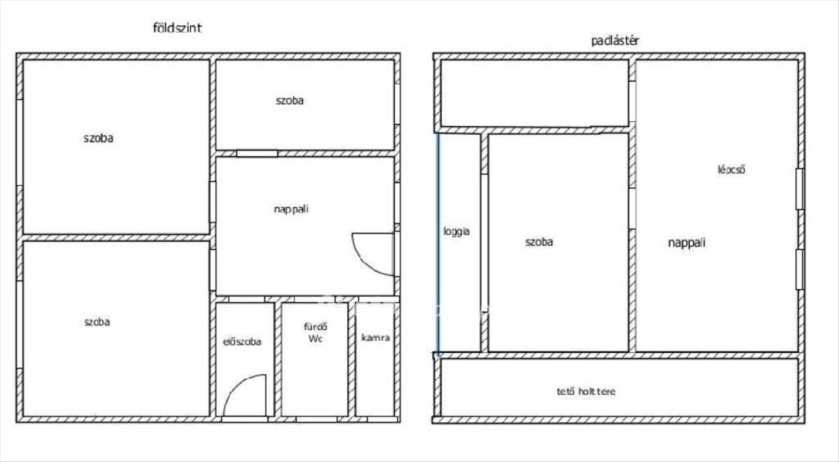 A földszinten 2, 5 szoba, fürdőszoba, tágas előszoba (innen vezet feljárat a padlástérbe) található.