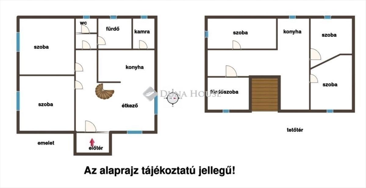 A második emeletre stabil lépcsőn juthatunk fel, itt is van fürdőszoba, 3 szoba és egy konyha ami gardróbként vagy raktárként is hasznos lehet.
