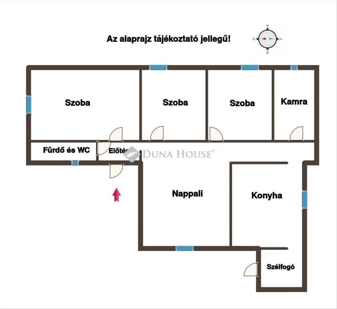 Az ingatlan praktikus elosztású: 3 szoba, nappali, konyha, fürdőszoba mellékhelyiséggel, valamint tároló és kamra található benne.