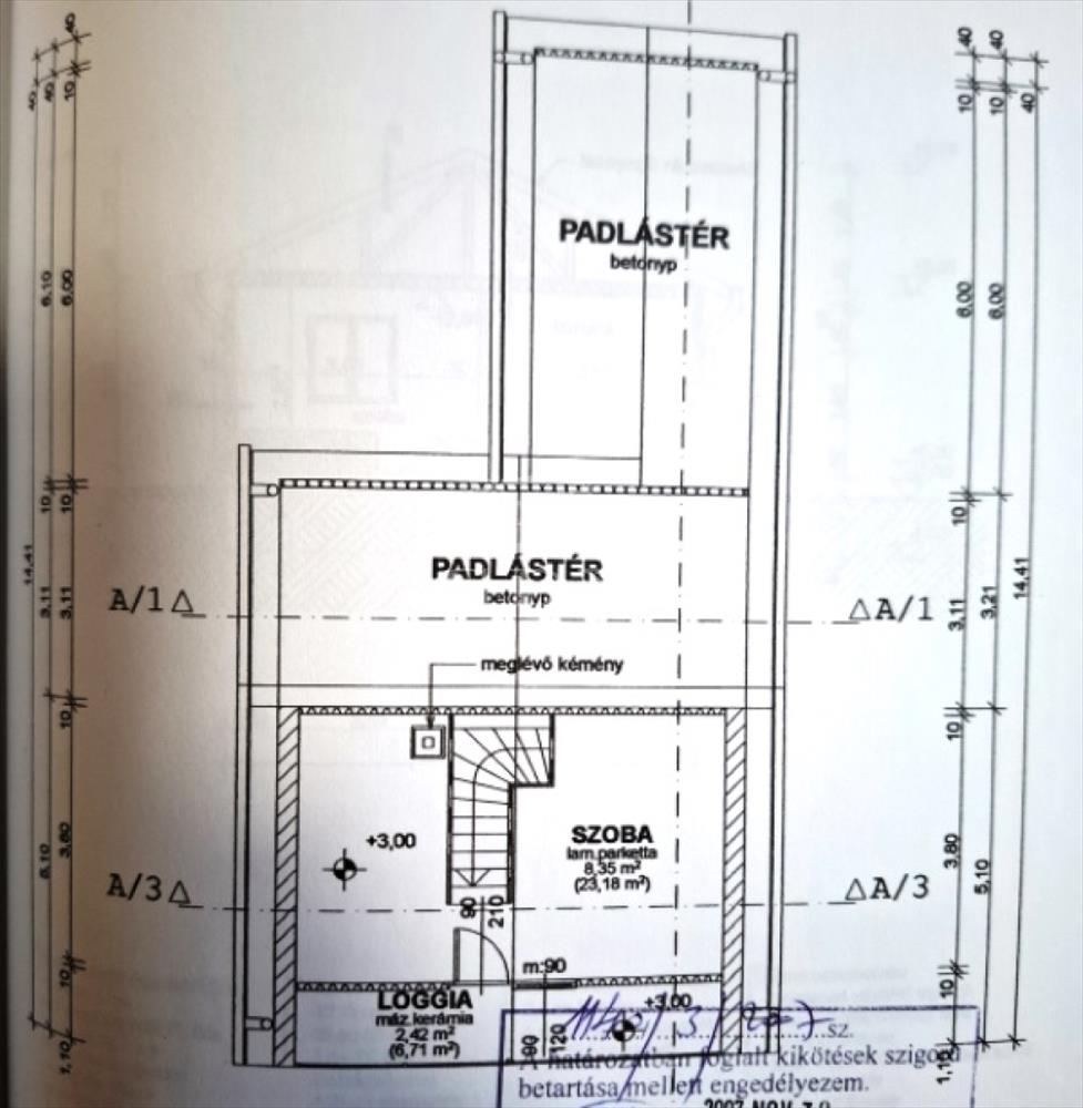 az emelet helyiségei: szoba 23, 2 m2, fürdőszoba 3, 4 m2, loggia 8, 5 m2.