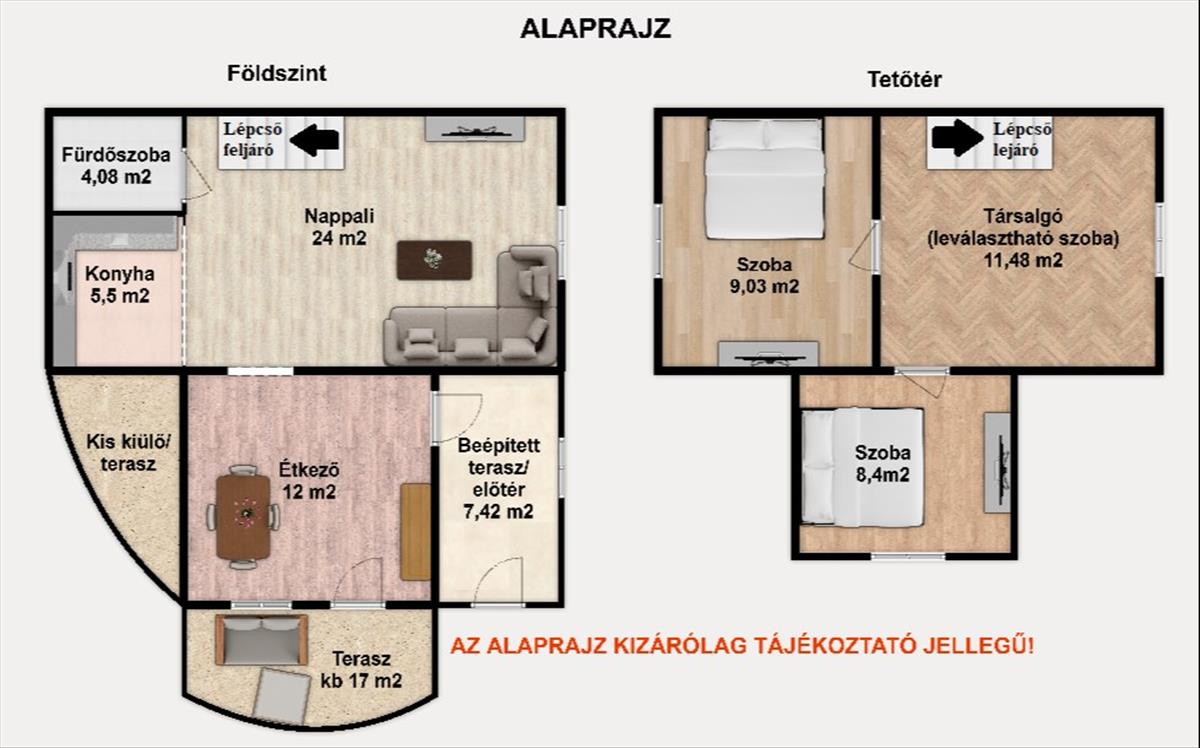- Tetőtér: 2 külön nyíló szoba, társalgó, amely igény szerint könnyen harmadik szobává alakítható