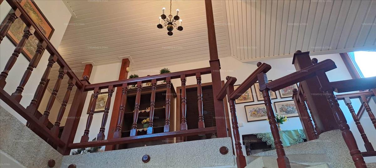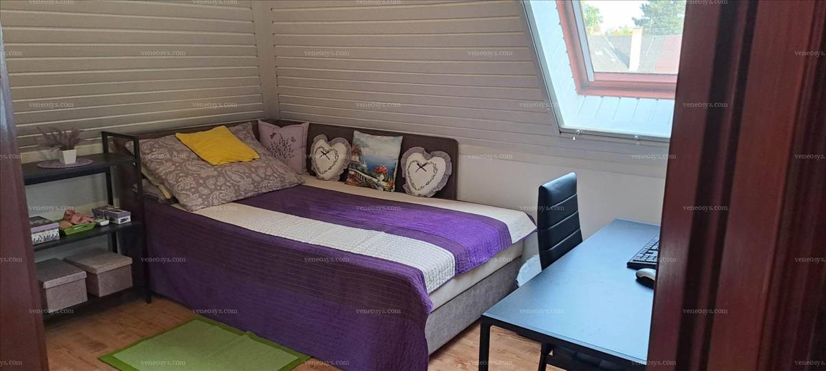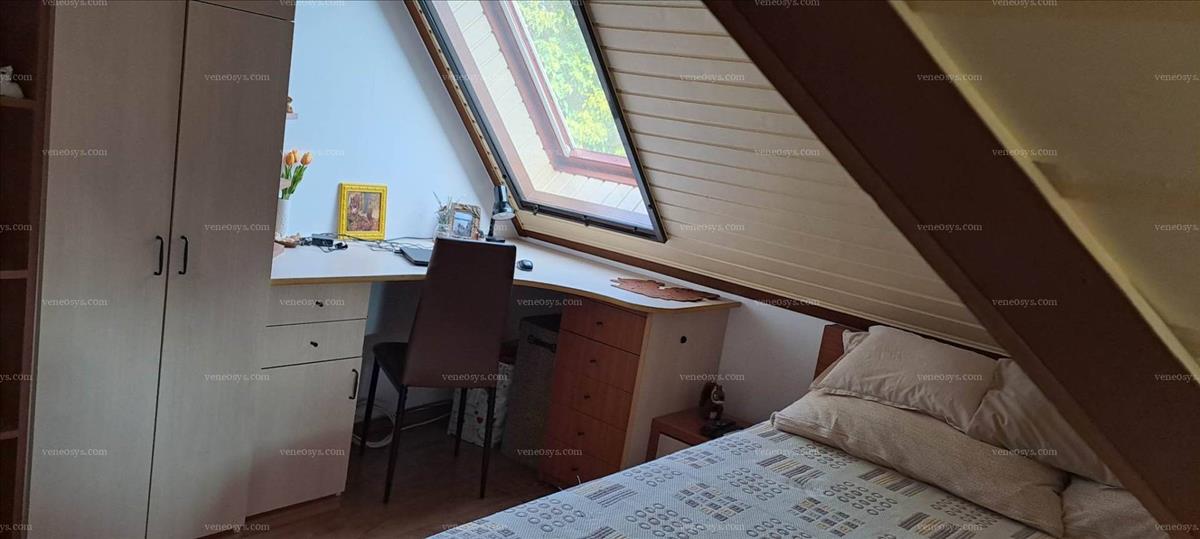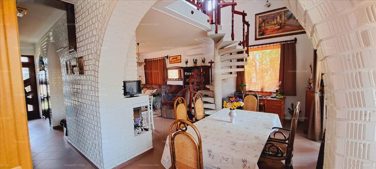 A lakóház fűtött területe: 165 m2. Fsz. : Előszoba, konyha, étkező, nappali, kádas fürdőszoba + külön wc, beépített szekrények. (A földszinten a nappaliból is leválasztható egy külön hálószoba, igény szerint. ) Tetőtér: 3 szoba, zuhanyzós fürdőszoba, közlekedő. a szuterénben, mosókonyha, garázs, tárolók, kazán és medence gépház van.