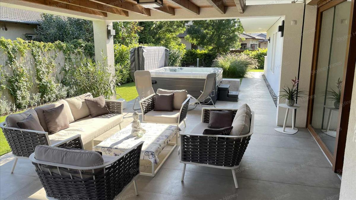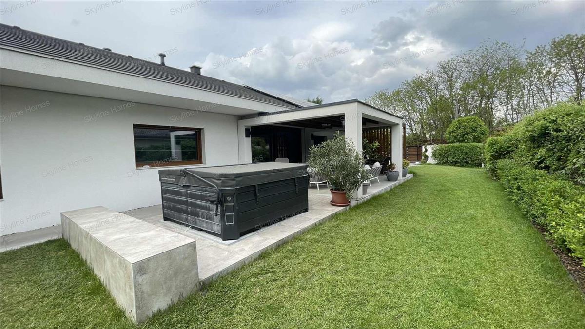 A nappaliból kiérve a 20 m2-es tágas teraszra érkezünk ami mellett egy 6 fős Jakuzzi is helyet kapott. Tovább haladva az örökzöld kertbe érkezünk, ami díszíti a telek további részét. Az épület felett fekvő padlástér pedig lehetőséget biztosít a pakolásra.