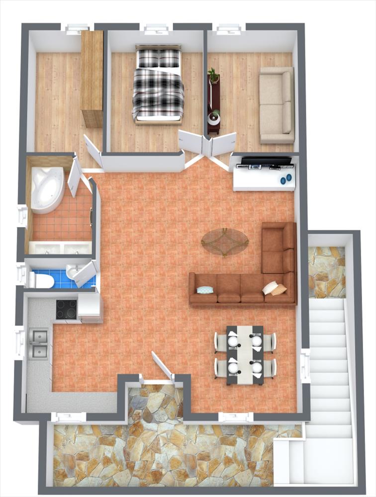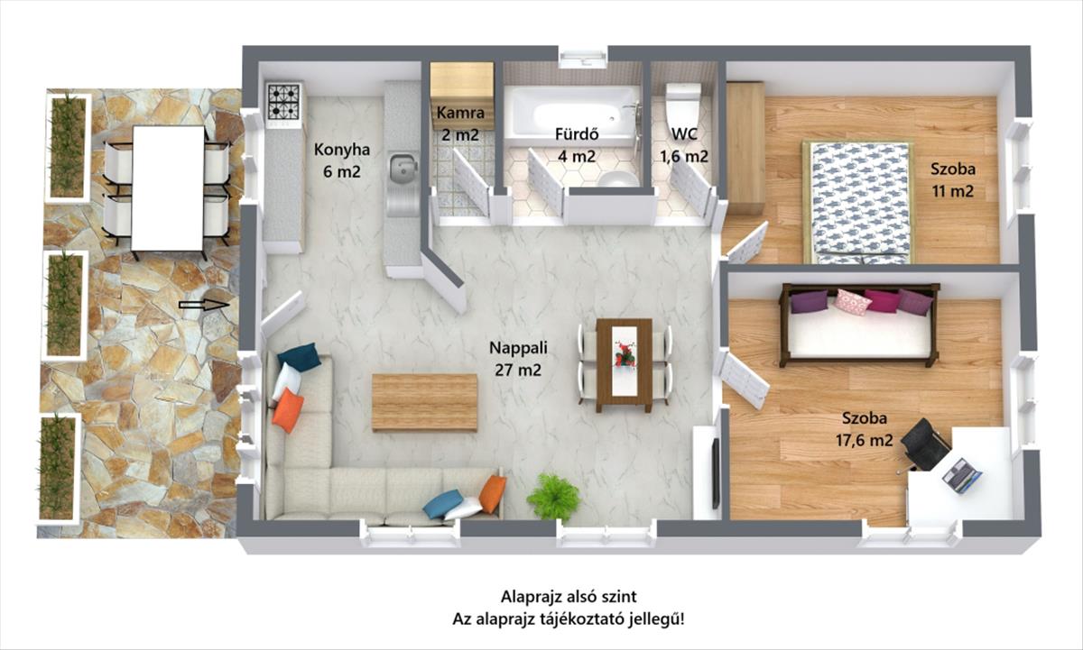 Egy igazi otthon a család minden tagjának! Az emeletes ház alsó szintjén tágas nappali és konyha, két szoba és fürdőszoba várja a családot. a felső szint jelenleg külső lépcsőn közelíthető meg, de a belső lépcső bármikor visszaállítható, így a két szint együtt vagy külön is használható.