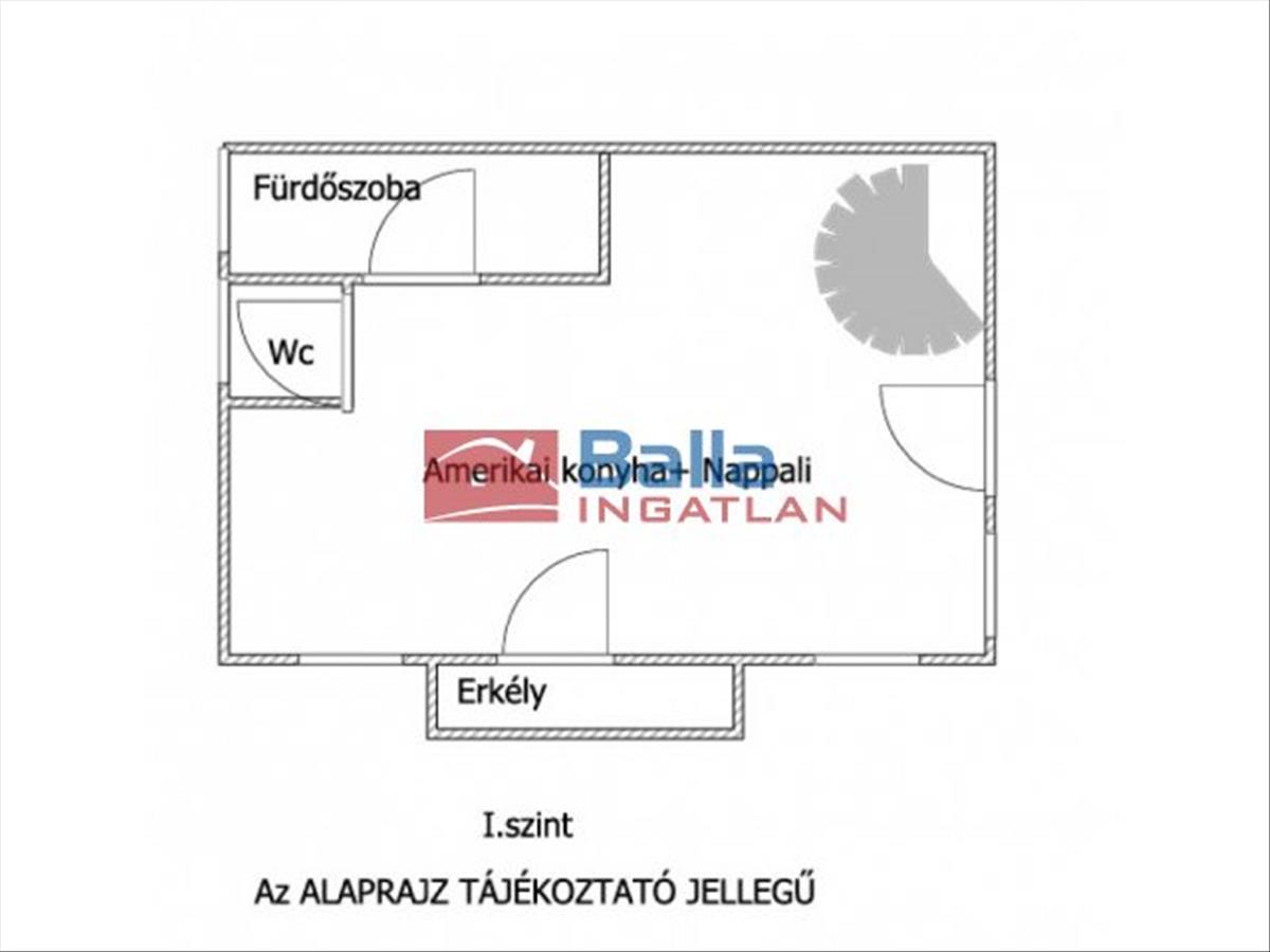 Földszint: amerikai konyhás nappali (55 m²), fürdőszoba káddal és zuhannyal, külön Wc, erkély (4 m², délnyugati fekvésű).