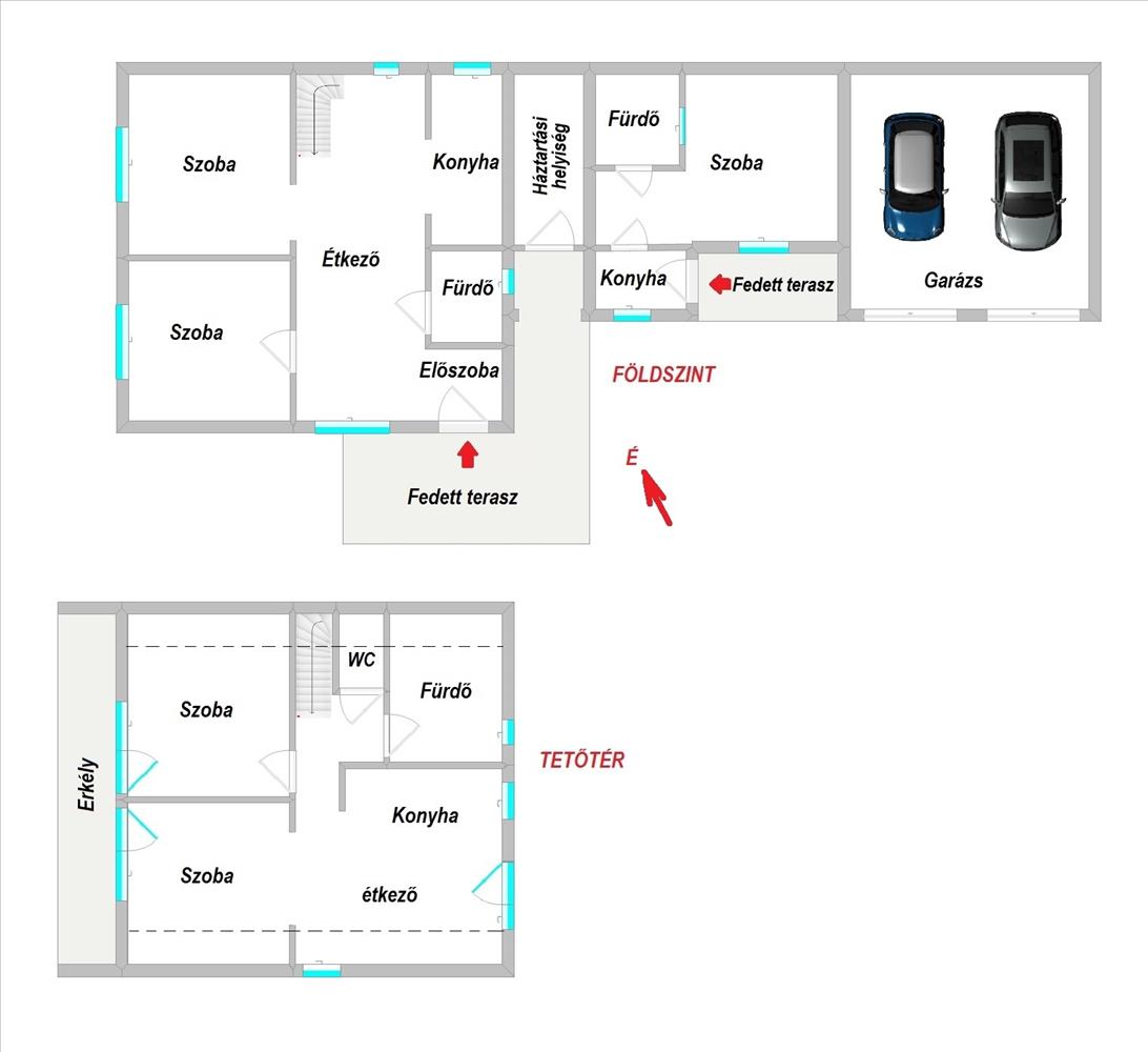 •egy 115 m²-es, kétszintes, kétgenerációs családi ház
