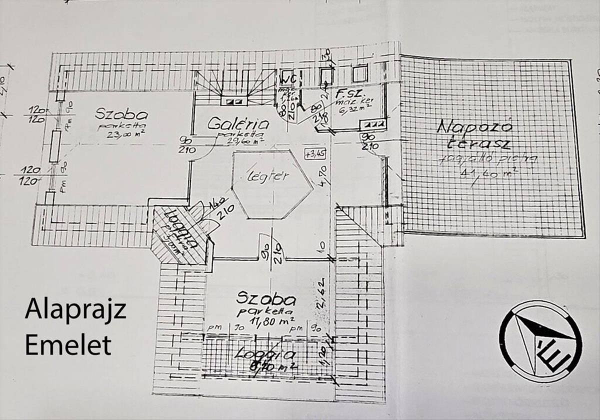 Emelet: (80 m2): Hall 29, 6 m2, Szoba 23 m2, Szoba 11, 8 m2, Wc 1, 26 m2, Fürdő 6, 32 m2, Loggia 3 m2, Loggia 5, 7 m2. . . Ezen felül Napozó terasz 41, 4 m2