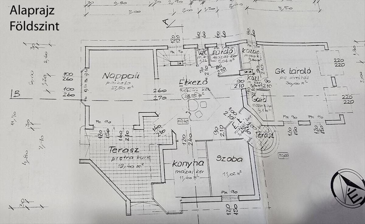 Földszint (100 m2): Előszoba 3, 6 m2, Nappali 27, 5 m2, Étkező 28, 55 m2, Konyha 11, 4 m2, Szoba 11, 02 m2, Wc 1, 26 m2, Fürdő 5, 04 m2, Közlekedő 3, 3 m2, Mosókonyha 4, 1 m2, Kazán 4, 8 m2. . . Kapcsolódik hozzá egy: nyitott terasz 19, 4 m2, Gépkocsi tároló 30 m2