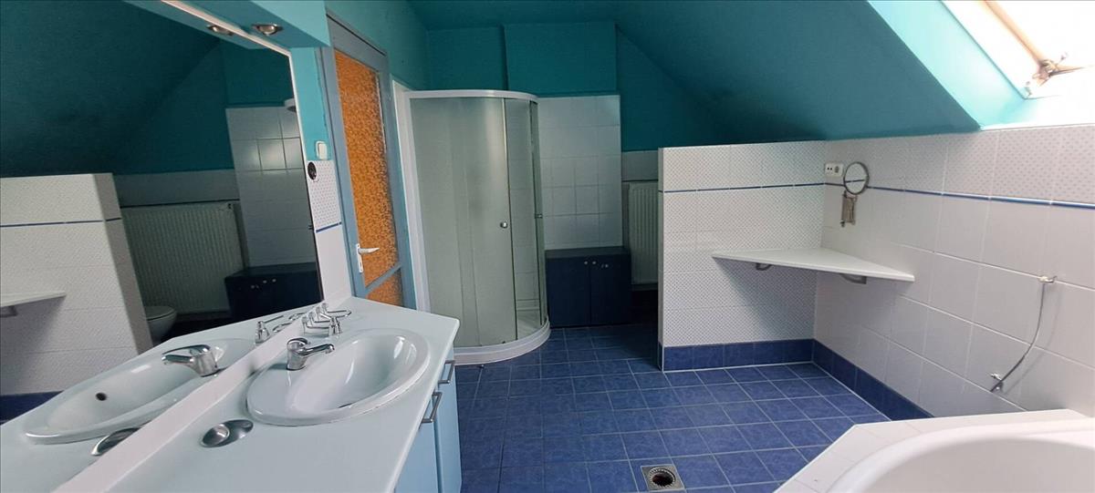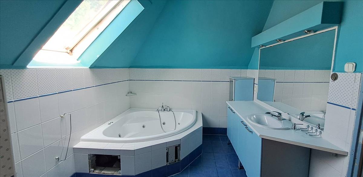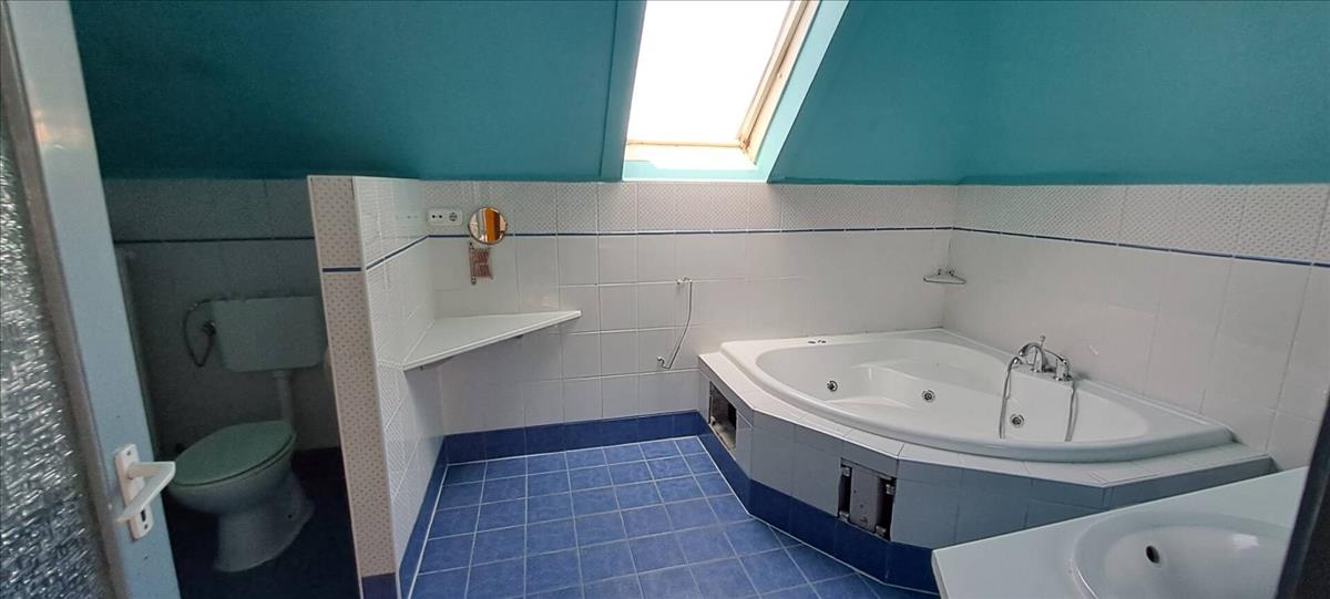 Emelet: két nagy méretű hálószoba, közlekedő, gardrób, tágas fürdőszoba zuhanyzóval, sarokkáddal és WC-vel.