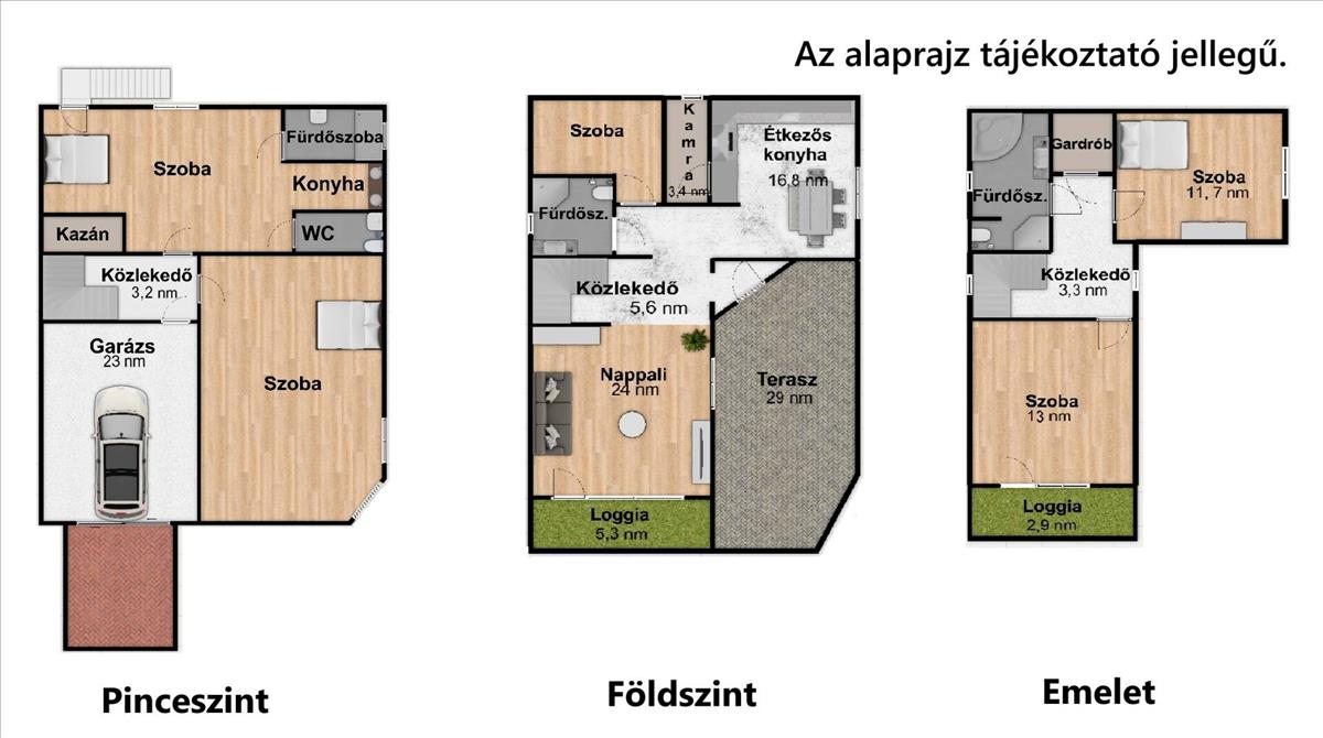 A három szinten összesen nettó 177 m2 lakótéren az alábbi helyiségek találhatók: