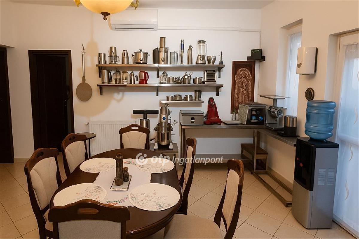 A konyha diófa bútorzattal és beépített, minőségi gépekkel felszerelt. Az ingatlanhoz tartozó beépített szekrények szintén diófából készültek, így egységes, időtálló stílust adnak a belső térnek.