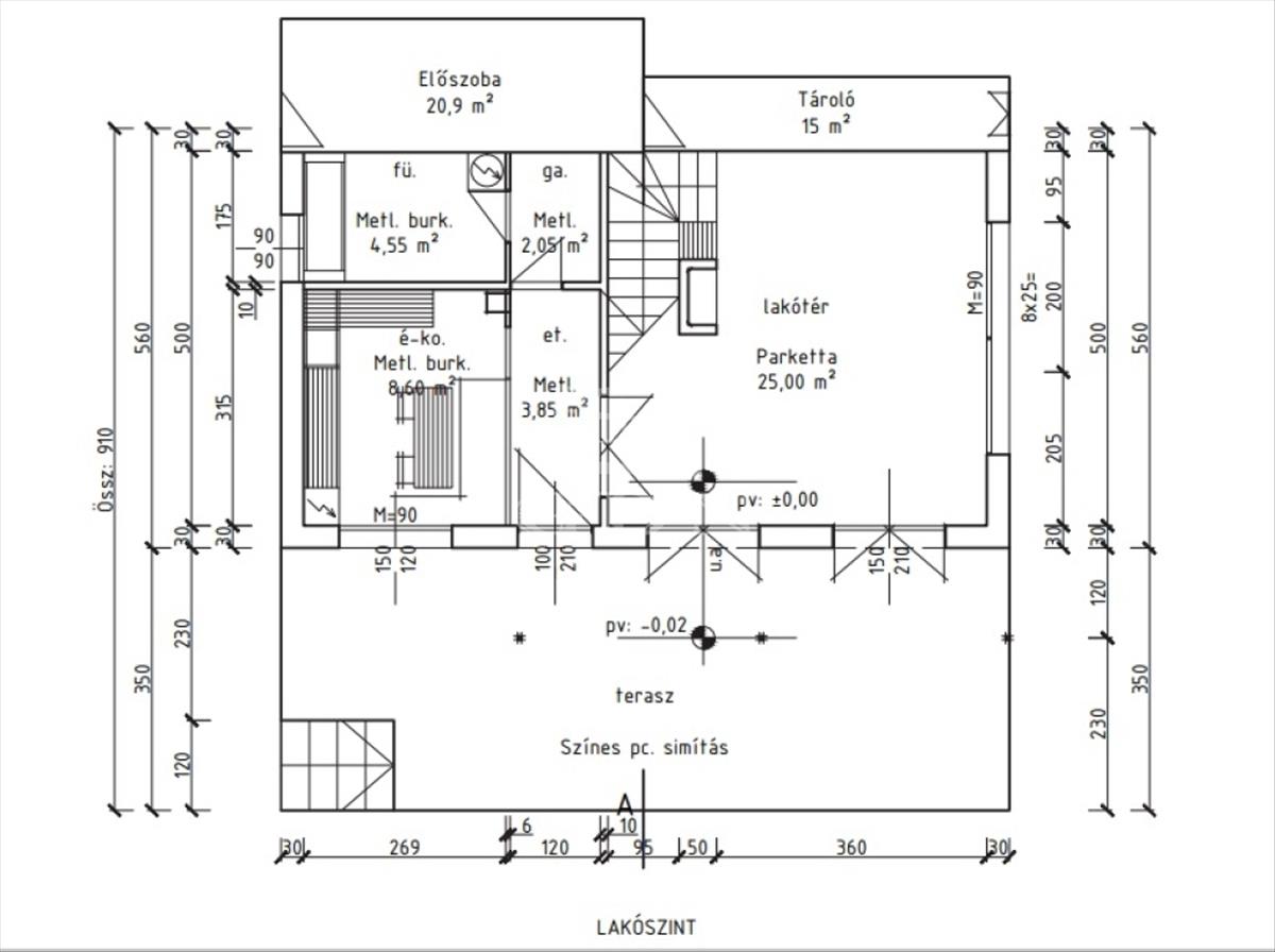 Szintek: pince szint: 23 nm, lakás szint: 45 nm+28 nm előtér, tetőtér: 38 nm.
