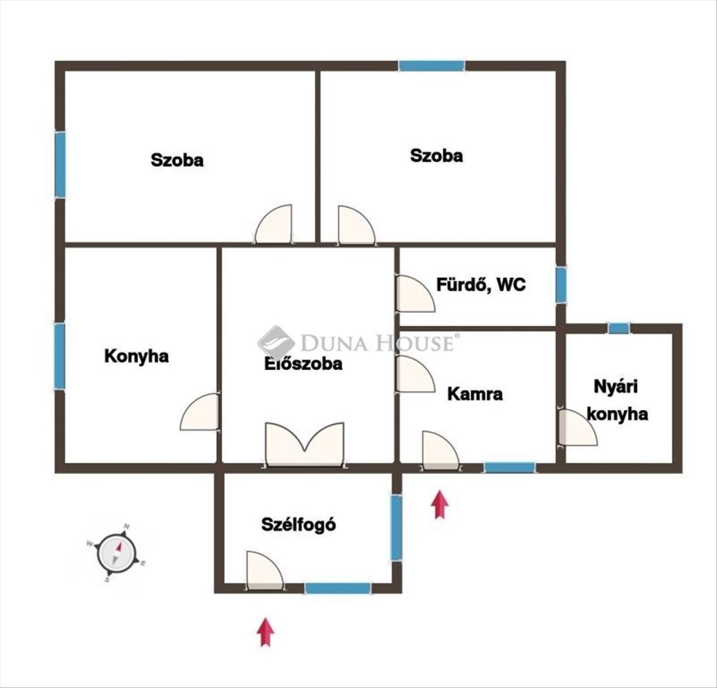 - 86 m²-es lakótér: 2 tágas szoba, konyha, nyárikonyha, kamra, fürdő-WC, előszoba