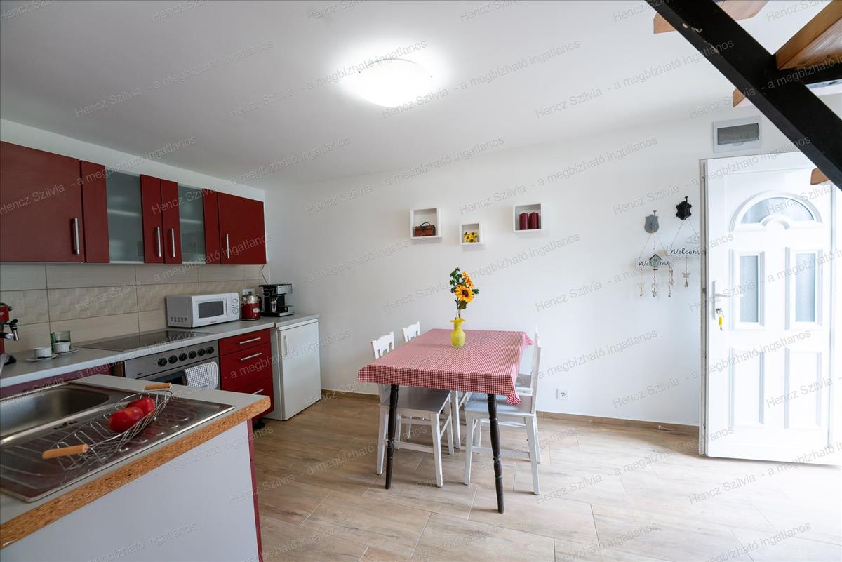- Különálló apartman (50 m²): Kétszintes, klimatizált vendéglak (+konvektoros fűtés). Földszinten konyha, nappali és fürdő; az emeleten 2 hálószoba található.