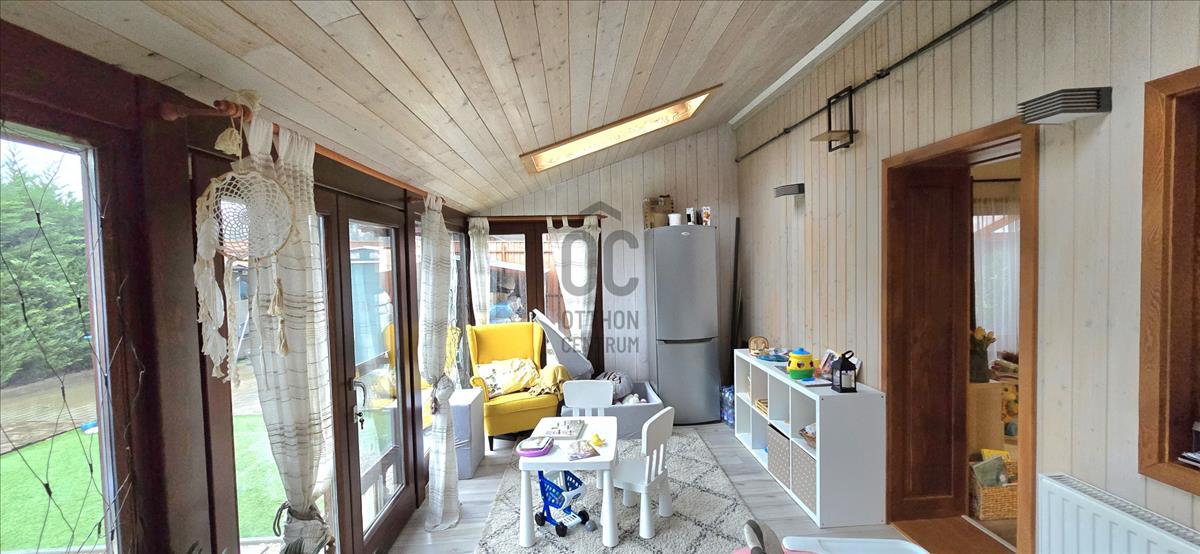 Tágas nappali mellett a világos, fűtött télikert növeli a teret.